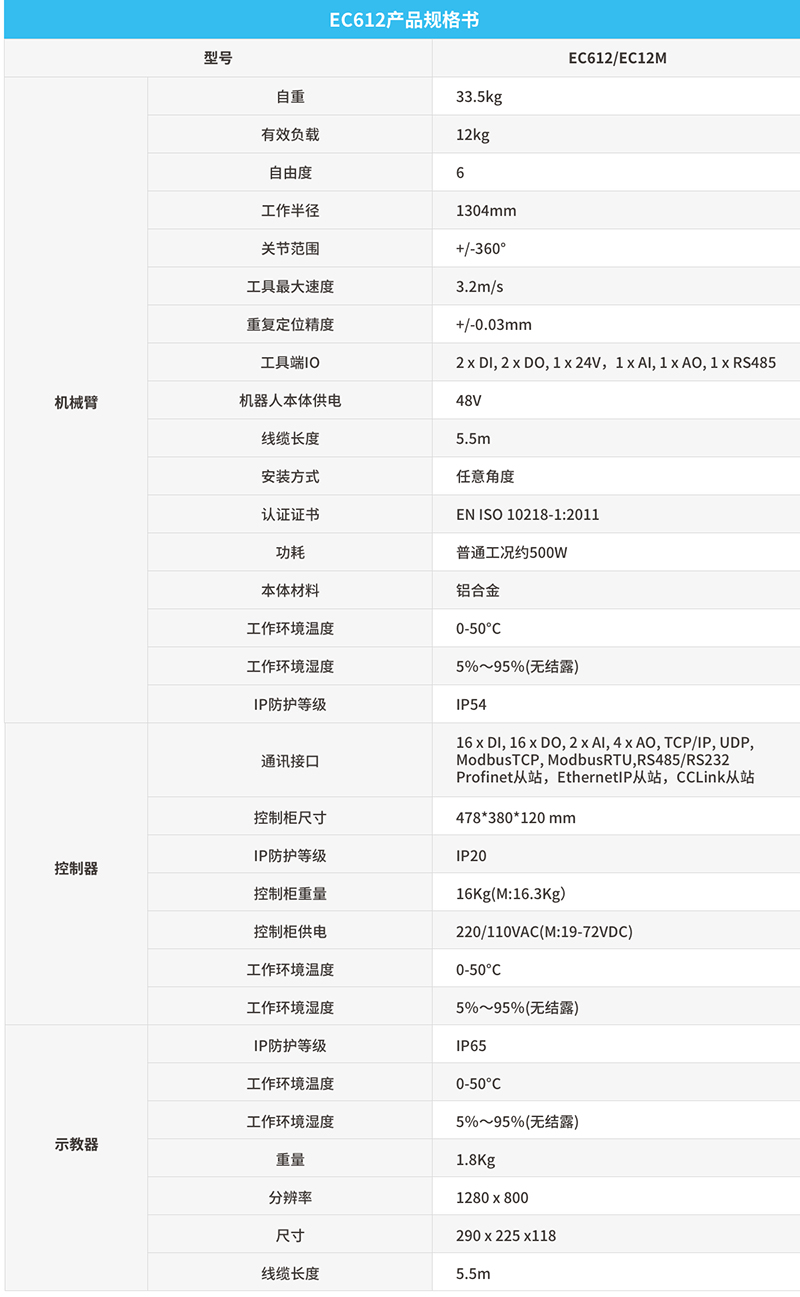 • 六自由度、自重33.5kg、負載12kg • 工作半徑1304mm • 重復定位精度±0.03mm