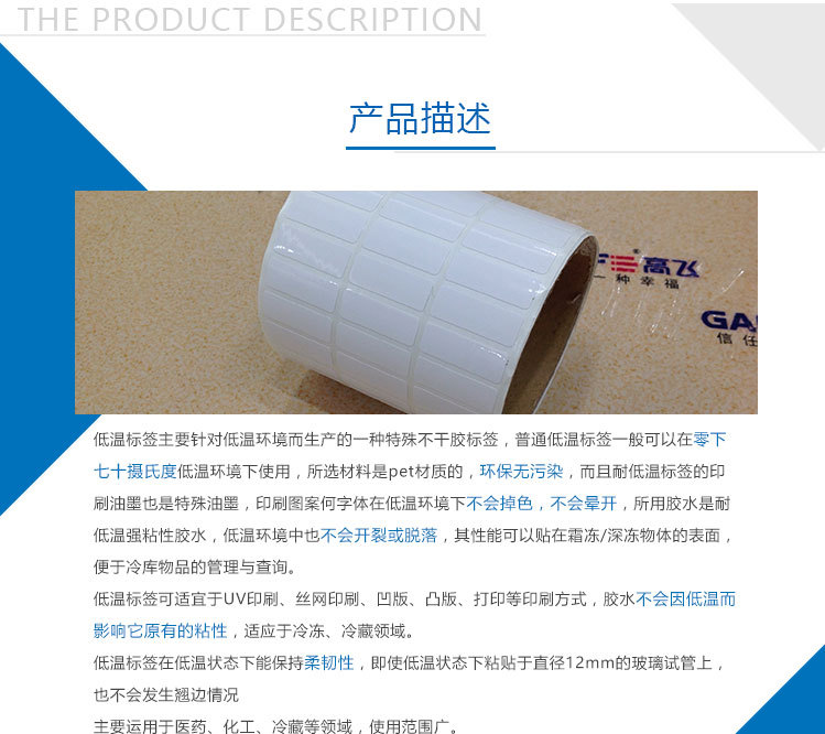 1、標簽的膠水不滲入物體產品表面,平且膠水在低溫狀態(零下70度或更低)保持相當的粘力,保持不脫落。