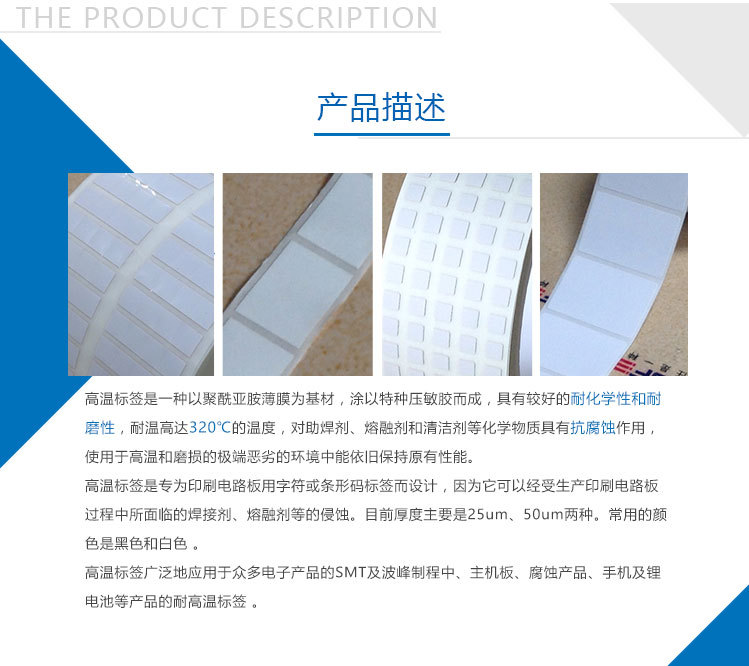 高溫標簽聚酰亞胺薄膜為基材,涂以特種壓敏膠而成,具有較好的耐化學(xué)性和耐磨性,耐溫范圍200℃~600℃,對助焊劑、熔融劑和清潔劑等化學(xué)物質(zhì)具有抗腐蝕作用,使用于高溫和磨損的極端惡劣的環(huán)境中能保持原本性能。它是專為印刷電路板用字符或條形碼標簽而設(shè)計,因為它可以經(jīng)受生產(chǎn)印刷電路板過程中所面臨的焊接劑、熔融劑等的侵蝕。目前厚度主要是25um、50um兩種。常用的顏色是黑色和白色 。高溫標簽廣泛地應(yīng)用于眾多電子產(chǎn)品的SMT及波峰制程中、主機板、腐蝕產(chǎn)品、手機及鋰電池等產(chǎn)品的PCB板高溫標簽。