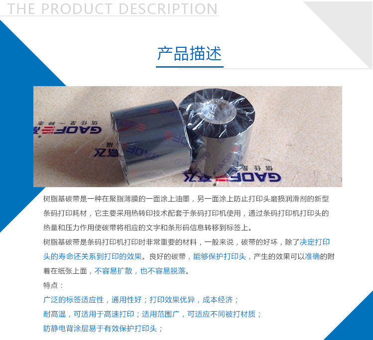 樹脂基碳帶品質高、高速打印性能,優異的耐磨擦、耐熱、耐腐蝕、耐久性能,耐磨能滿足各種苛刻環境要求,高敏感度,確保優異的圖像打印效果,防靜電背涂層,有效保護打印頭。