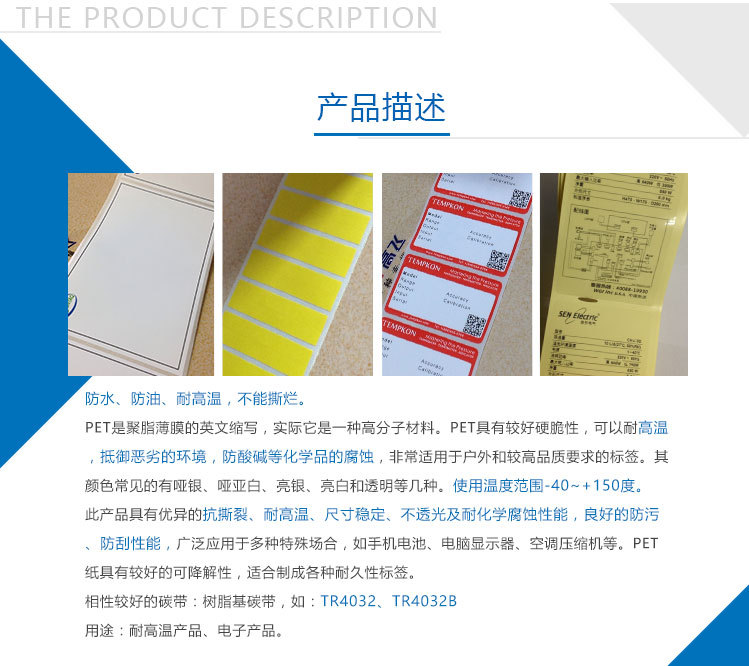 PET標(biāo)簽聚酰亞胺薄膜為基材,涂以特種壓敏膠而成,具有較好的耐化學(xué)性和耐磨性,耐溫范圍200℃~600℃,對助焊劑、熔融劑和清潔劑等化學(xué)物質(zhì)具有抗腐蝕作用,使用于高溫和磨損的極端惡劣的環(huán)境中能保持原本性能。它是專為印刷電路板用字符或條形碼標(biāo)簽而設(shè)計,因為它可以經(jīng)受生產(chǎn)印刷電路板過程中所面臨的焊接劑、熔融劑等的侵蝕。目前厚度主要是25um、50um兩種。常用的顏色是黑色和白色 。PET標(biāo)簽廣泛地應(yīng)用于眾多電子產(chǎn)品的SMT及波峰制程中、主機板、腐蝕產(chǎn)品、手機及鋰電池等產(chǎn)品的PCB板高溫標(biāo)簽。