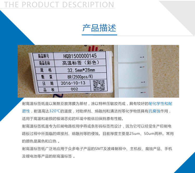 高溫標簽聚酰亞胺薄膜為基材,涂以特種壓敏膠而成,具有較好的耐化學性和耐磨性,耐溫范圍200℃~600℃,對助焊劑、熔融劑和清潔劑等化學物質具有抗腐蝕作用,使用于高溫和磨損的極端惡劣的環境中能保持原本性能。它是專為印刷電路板用字符或條形碼標簽而設計,因為它可以經受生產印刷電路板過程中所面臨的焊接劑、熔融劑等的侵蝕。目前厚度主要是25um、50um兩種。常用的顏色是黑色和白色 。高溫標簽廣泛地應用于眾多電子產品的SMT及波峰制程中、主機板、腐蝕產品、手機及鋰電池等產品的PCB板高溫標簽。