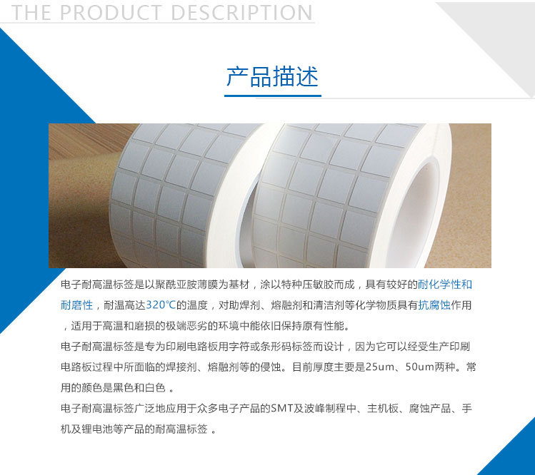 高溫標簽聚酰亞胺薄膜為基材,涂以特種壓敏膠而成,具有較好的耐化學性和耐磨性,耐溫范圍200℃~600℃,對助焊劑、熔融劑和清潔劑等化學物質具有抗腐蝕作用,使用于高溫和磨損的極端惡劣的環境中能保持原本性能。它是專為印刷電路板用字符或條形碼標簽而設計,因為它可以經受生產印刷電路板過程中所面臨的焊接劑、熔融劑等的侵蝕。目前厚度主要是25um、50um兩種。常用的顏色是黑色和白色 。高溫標簽廣泛地應用于眾多電子產品的SMT及波峰制程中、主機板、腐蝕產品、手機及鋰電池等產品的PCB板高溫標簽。