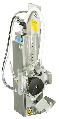 針對脆弱的產品表面或行進中的產品。標 簽可透過氣壓噴射于產品表面上完成吹 貼動作。可設定氣缸停止在離產品表面 5-10mm 之距離。
